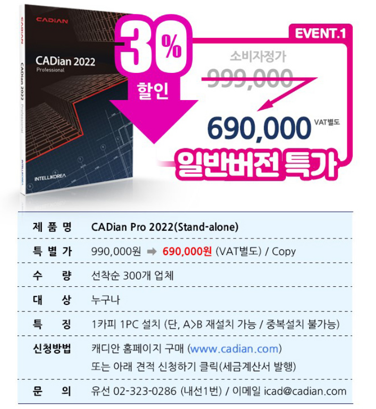 더욱 빨라지고 강력해진 CADian 2022 ! AutoCAD(오토캐드)를 대체하는 유일한 국산 캐드 가격대비 성능 우수, 평생 사용 가능한 영구라이선스 신속한 무상 1:1 원격기술지원 서비스 바로가기