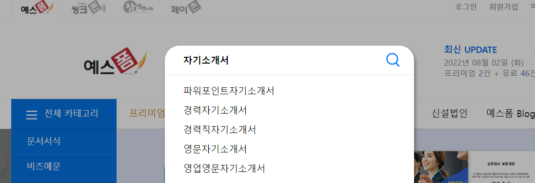 예스폼은 이력서 양식 사이트로 여러가지 포맷으로 자기소개서 양식뿐 아니라 여러 양식의 이력서들을 무료 & 유료 다운로드 가능한 사이트입니다.