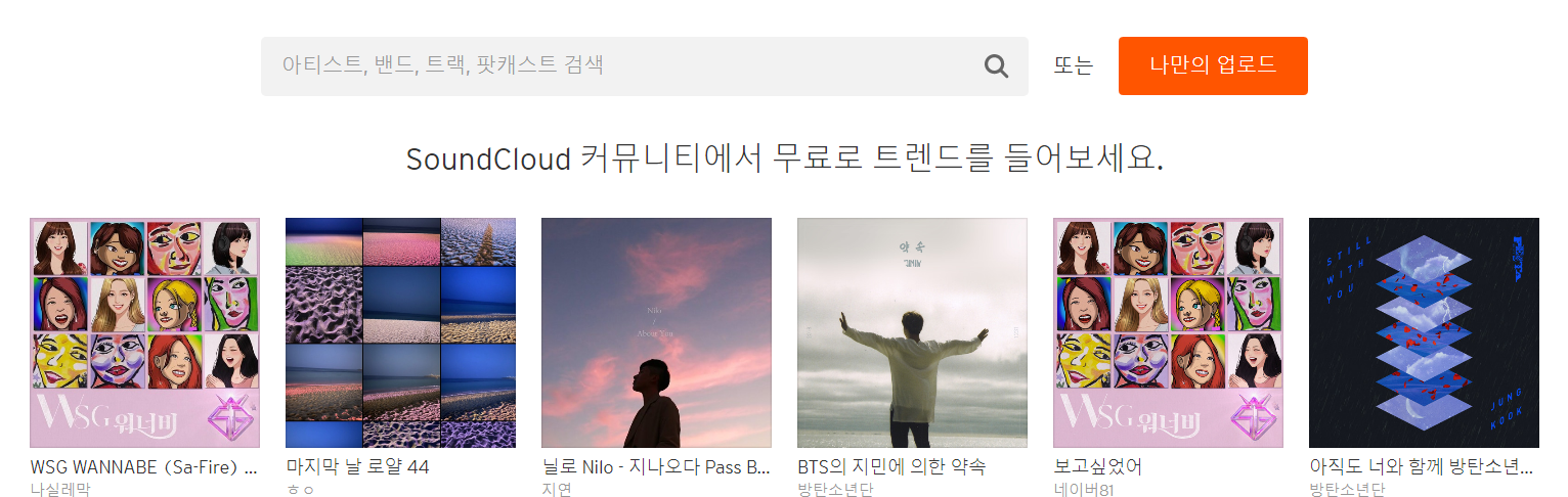 사운드 클라우드는 대부분 사람들이 알 정도로 유명한 사이트입니다. 검색창의 원하는 노래만 쳐도 바로 나오며,