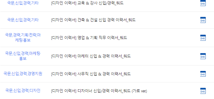 이런 식으로 종류별 이력서가 있습니다. 많은 분들이 이용하는 사이트이니 걱정 말고 사용하세요!