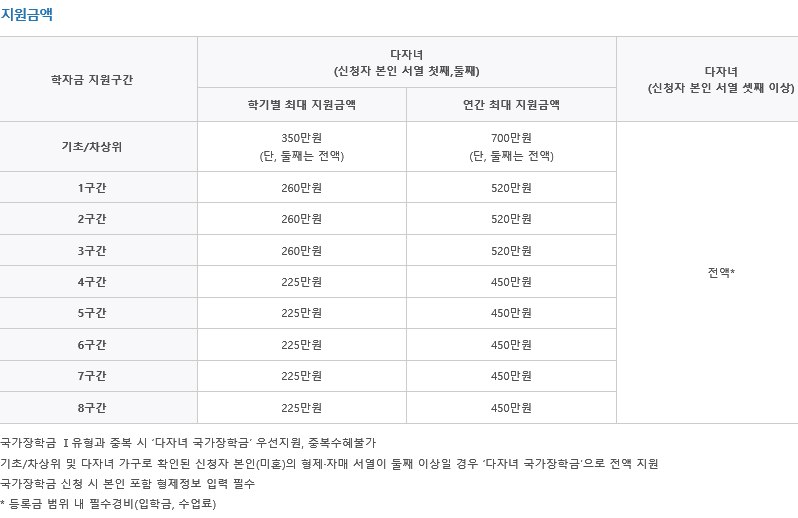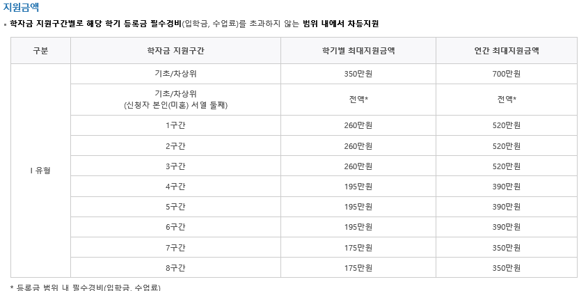 - 학자금 지원구간별로 해당 학기 등록금 필수경비(입학금, 수업료)를 초과하지 않는 범위 내에서 차등지원