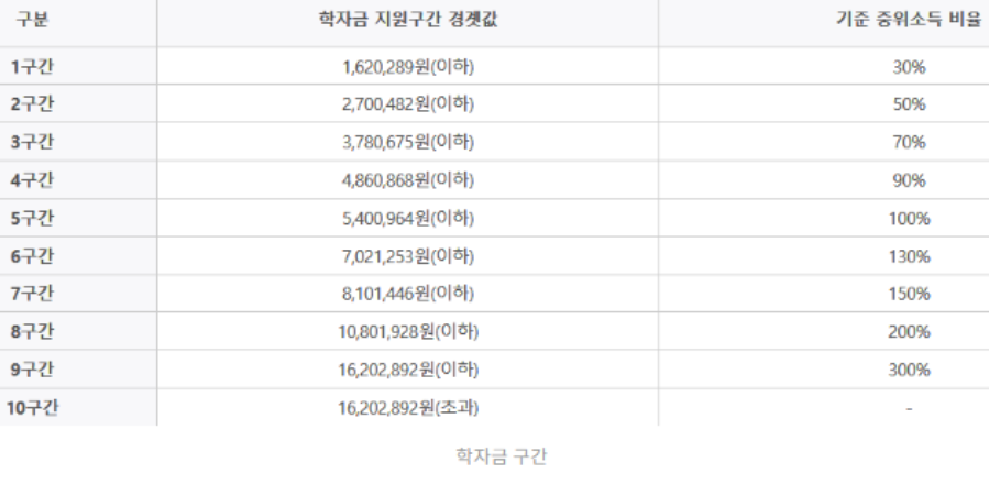 학자금 지원구간 경곗값을 확인하신 후 아래 지원 금액을 참고 하시면 됩니다.