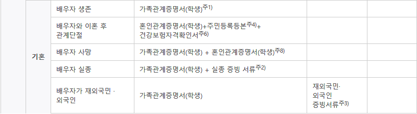 - 주8) 혼인관계증명서: 가족관계증명서(상세)를 통해 배우자 사망이 확인되는 경우 제출서류에서 제외 가능함
