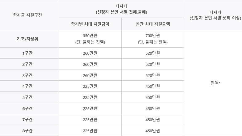 - 기초/차상위 및 다자녀 가구로 확인된 신청자 본인(미혼)의 형제·자매 서열이 둘째 이상일 경우 ‘다자녀 국가장학금’으로 전액 지원