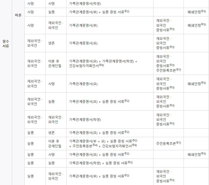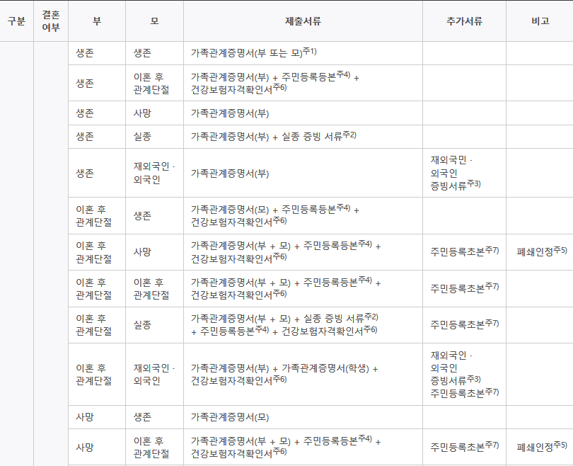 - 주3) 재외국민·외국인 증빙서류: 가족관계증명서로 확인이 안 되는 경우,①재외국민(재외국민 주민등록증, 재외국민등록부등본), ②외국인(외국인등록사실증명, 국내거소사실증명원, 여권사본, 출입국사실증명원 또는 주민등록초본(주소변경 포함))