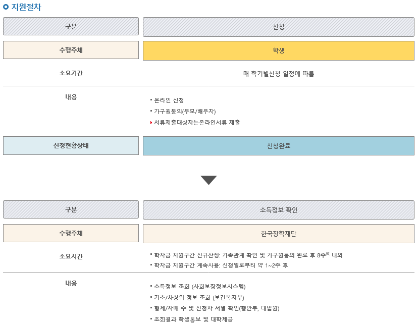- 기초, 차상위 대상자는 본인 또는 가구원(미혼은 부 또는 모, 기혼은 배우자로 가구원동의가 완료된 가구원) 명의의 서류 제출, 매학기 자격확인 진행