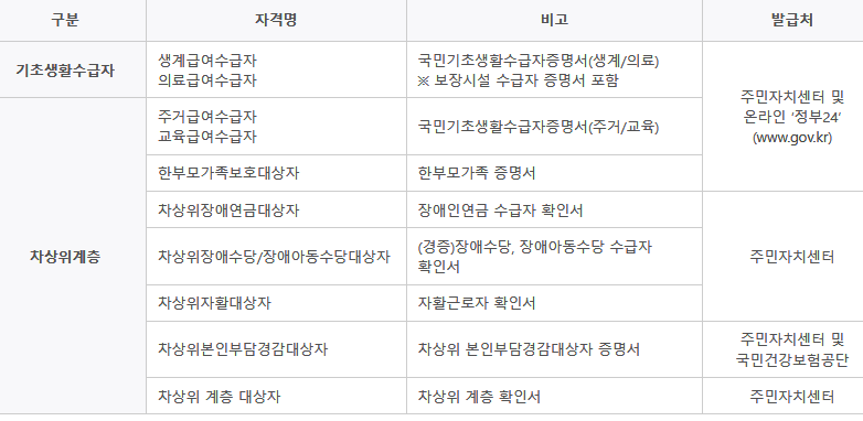 - 주2) 실종 증빙 서류: 가출·행방불명·실종 신고접수증(경찰서), 실종·부재 선고 신고증(법원), 거주불명자등(초)본(건강보험자격확인서 함께 제출)