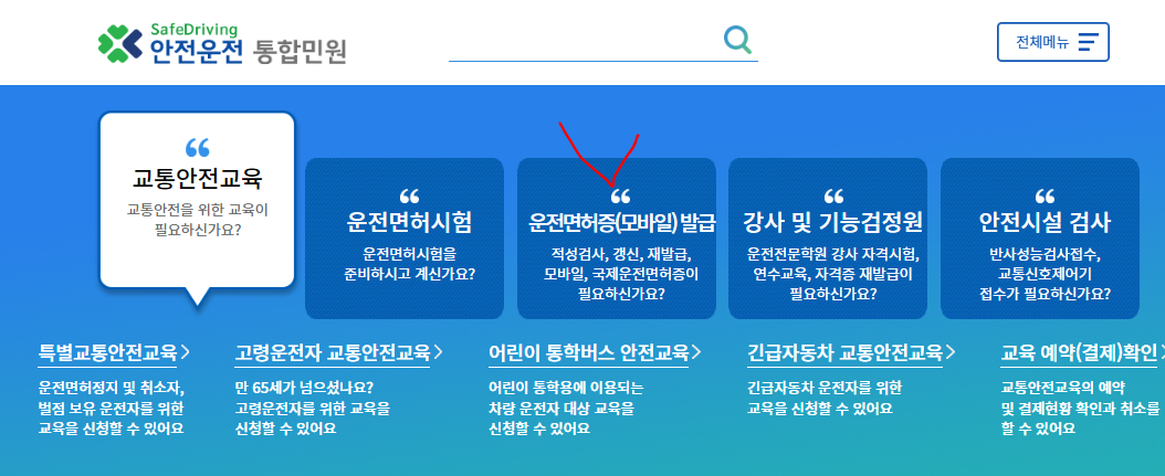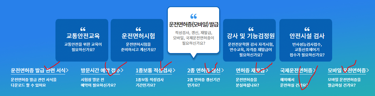 아래 원하는 면허증 재발급, 2종면허 갱신, 1종보통 적성검사, 모바일 운전면허증 발급 등 원하는 민원을 클릭 하시면 됩니다.