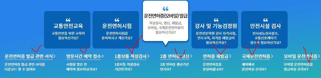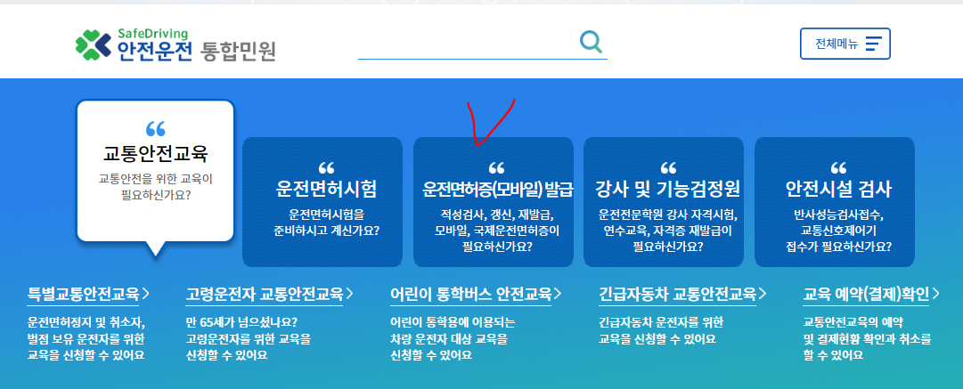 홈페이지에 접속하시면 위와 같은 사진이 나오며 빨간색으로 체크한 운전면허증(모바일)발급을 클릭하시면 됩니다.