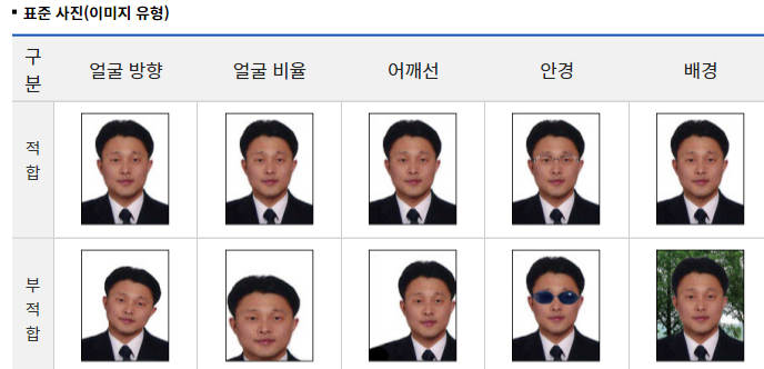 - 머리카락으로 눈을 가려서는 안되며, 얼굴 전체(이마~턱, 얼굴 윤곽 등)가 완전히 노출되어야 함