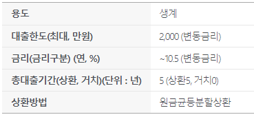 대출은 최대 5년까지 빌릴 수 있으며 거치기간 없이 바로 원리금균등분할 상환해야합니다.