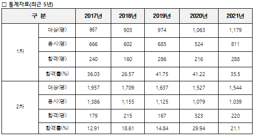 위 이미지는 최근 5년간 경영지도사 통계자료입니다. 응시생 수는 매년 증가 추세를 보이고 있으며 1차 시험의 경우 합격률은 평균 40%으로 높은 편은 아닙니다. 2차 시험은 합격률이 가장 높은 년도가 2020년에 29%으로 상단히 난도가 높은 시험으로 보입니다.