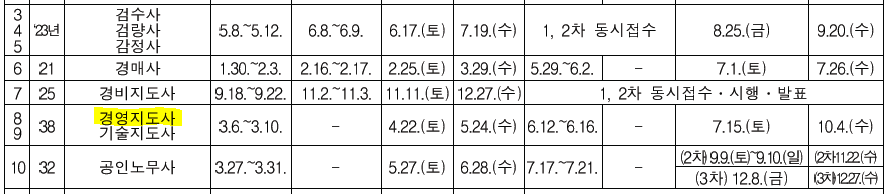 위 시험일정은 수험자의 시험 준비 등을 위하여 조기 확정하여 안내된 것으로 최종 시행 일정, 지역 등 자격 관련 상세내역은 자격별 시행계획 공고문을 반드시 확인하시기 바랍니다. 경영지도사의 정기접수는 3월 6일~10일이며 빈자리 접수기간은 없습니다. 1차 시험의 시행일은 4월 22일이며 합격자 발표일은 5월 24일입니다. 2차 시험의 정기 접수일은 6월 12일~16일이며 시험시행일은 7월 15일입니다. 합격자 발표일은 10월 4일입니다. 응시생분들은 모두 위 기간을 확인하시고 기간 내에 접수하시어 좋은 결과 있길 바랍니다.