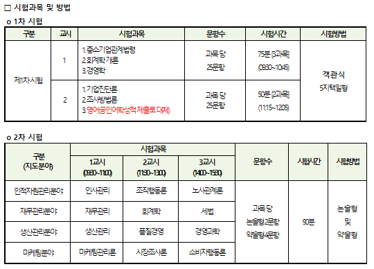 경영지도사 시험은 제1차시험과 제2차 시험으로 나누어져 있습니다. 1차 시험은 1,2교시로 나누어지며 1교시에는 '중소기업관계법령', '회계학 개론', '경영학'으로 총 3과목이며 과목당 25문항으로 총 75문항입니다. 시험시간은 75분이며 객관식 5 지태 일형으로 출제됩니다. 2교시는 '기업진단론', '조사방법론', '영어(공인 어학성적 제출로 대체)로 총 3과목이며 1교시와 동일하게 총 75문항이며 시험시간은 2과목이 50분입니다. 2차 시험은 '인적자원관리 분야', '재무관리 분야', '생산관리 분야', '마케팅 분야'로 구분됩니다. 각 분야별 시험과목과 교시는 위의 이미지를 참고하시기 바랍니다. 문항은 과목당 논술형 2문항, 약술형4문합입니다. 시험시간은 90분이며 문제는 논술형 및 약술형으로 출제됩니다.