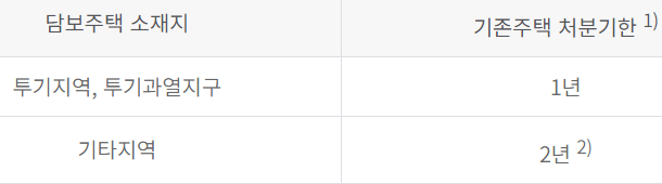 주택 수는 부부(미혼인 경우 본인)기준 무주택자 또는 1주택자(*구입용도에 따라 일시적으로 2주택을 허용하며, 담보주택 외 기존주택의 처분기한은 본 건 담보주택 소재지에 따라 차등 적용)
