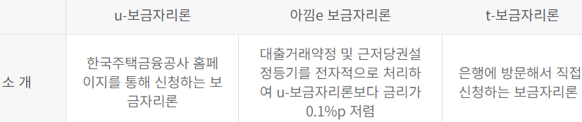 보금자리론에는 u-보금자리론, 아낌e 보금자리론 t-보금자리론이 있습니다.