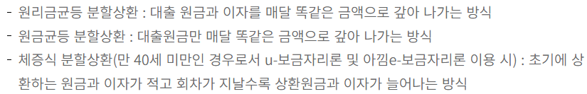 상환방식은 원리금 균등분할상환,원금균등 분할상환,체증식 분할상환 세가지 중 한가지를 선택하여 가능합니다.