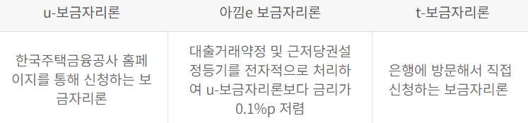 보금자리론은 u-보금자리론,아낌e 보금자리론 t-보금자리론 총 3가지가 있으며 아래와 같습니다.