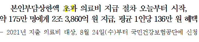 보건복지부와 국민건강보험공단에서 2021년 개인별 본인부담상한액이 확정되어서 8월 24일 수요일부터 상한액 초과금 지급 절차를 시작한다고 밝혔습니다.