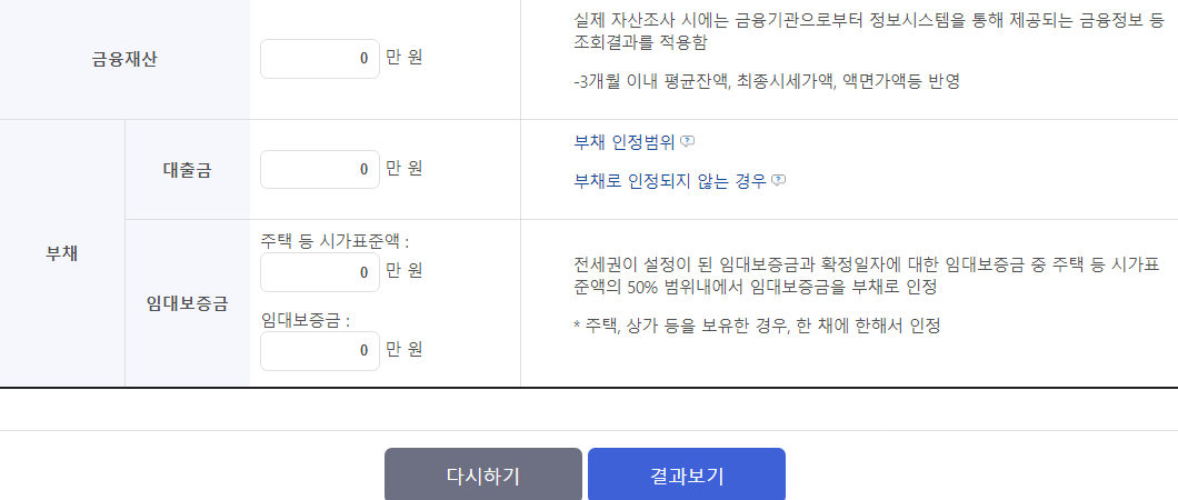 각 항목에 맞는 정보를 적은 후 결과보기를 통해 자신의 소득분위 확인이 가능합니다.