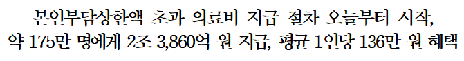 올해 개인별 본인부담상한액 확정이나면서 의료비 본인부담상한액을 초과하여 의료비를 지출한 174만 9,831명에게 총 2조 3,860억원이 지급될 예정이라고 합니다.