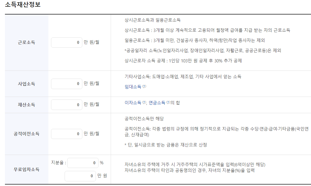 복지로 홈페이지를 통해 모의계산에서 기초연금, 장애인 연금,국민기초 생활보장을 클릭하여 아래 사진에 있는 정보들을 입력하면 됩니다.