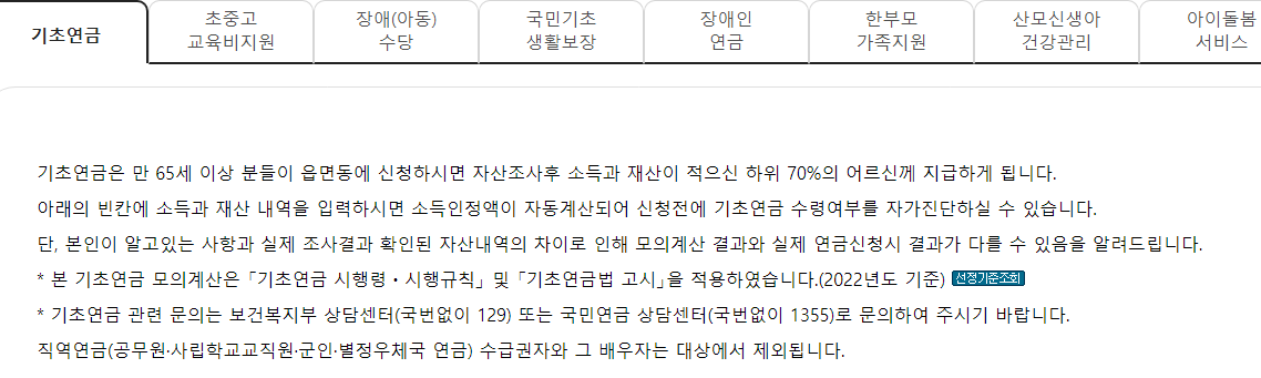소득분위 알아보는 곳 모의계산 정보입력 화면(기초연금) (bokjiro.go.kr)