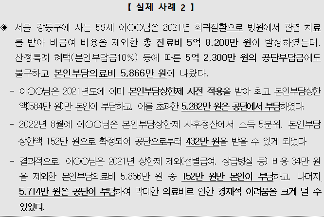 쉽게 한번 더 설명 드리자면 소득 분위에 따라 본인 부담 상한액이 정해지며, 정해진 의료비 보다 초과한 금액에 대해 국민건강보험공단에서 대신 부담해줘서 이미 부담한 금액에 대해 환급을 받을 수 있는 제도입니다.