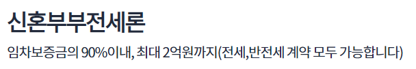 이 상품은 신혼부부 또는 결혼예정자를 대상으로 한국주택금융공사의 보증서를 담보로 임차보증금의 90% 내에서 주택의 전세자금을 지원해드리는 상품입니다.