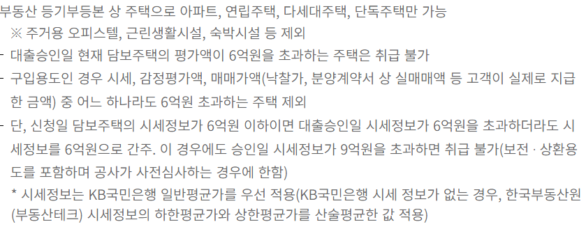 - 부부합산 연소득 6천만원 이하 , 단 신혼가구 및 다자녀가구 우대금리는 부부합산 연소득 7천만원 이하까지 가능