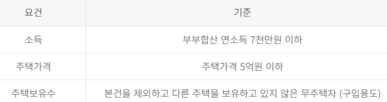 - 소득의 경우 연소득 7천만원 이하여야 가능하며 미혼이면 본인만 기혼이면 부부합산 기준입니다.