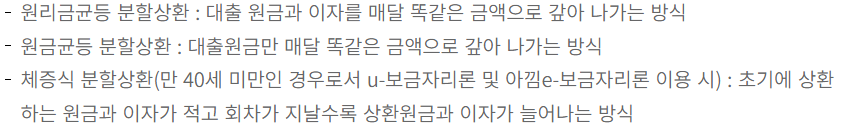 상호나방식은 원리금균등분할상환, 원금균등분할상환,체증식분할상환 세가지 중 한가지를 선택합니다.