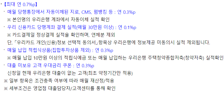 - 우리은행 자동이체 실적 보유(아파트관리비 1건 또는 통신비/공과금 3만원 이상)