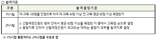 경비지도사의 합격지도사는 1차 시험의 경우 매 과목 100점을 만점으로 하여 매 과목 40점 이상, 전 과목 평균 60점 이상 득점하여야 하며, 2차 시험의 겨우 선발예정인원의 범위 안에서 평균 60점 이상을 득점한 자 중에서 고득점 순으로 결정됩니다. 만일 동점자로 인하여 선발예정인원이 초과되는 때에는 동점자 모두를 합격자로 결정합니다.