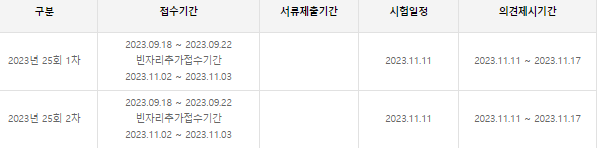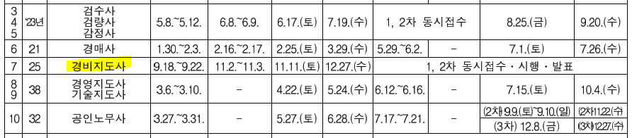 위 일정은 수험자의 시험 준비 등을 위하여 조기 확정하여 안내된 것으로 최종 시행 일정, 지역 등 자격관리 상세내역은 자격별 시행계획 공고문을 반드시 확인하시기 바랍니다. 빈자리 접수는 정기접수 환불로 발생한 수용인원 범위 내에서 선착순으로 이루어져 있음으로 조기 마감될 수 있습니다. 경비지도사의 1차 시험 정기접수일은 9월 18~22일이며 빈자리 접수기간은 11월 2일~3일입니다. 1차 시험 시행일은 11월 11일이며 합격자 발표일은 12월 27일입니다. 1차 시험과 2차 시험은 동시 접수로 진행되며 발표됩니다. 응시생분들은 기간 내에 접수하기 바랍니다.