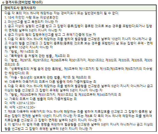 경비지도사는 응시조건은 없지만 결격사유는 있음으로 아래의 이미지를 참고하시기 바랍니다.