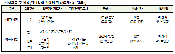 경비지도사는 제1차,2차 시험으로 나누어져 있습니다. 1차 시험은 필수과목으로 일반, 기계경 지도사 모두 '법학개론', '민간경비론'과목을 치르게 됩니다. 문항수는 과목당 40문항으로 총 80문항이며 시험시간은 80분입니다. 제2차 시험의 경우 필수과목으로 '경비업법(청원경찰법 포함)'이며 종목별로 해당 과목 중 한 가지 과목을 선택하여 치르게 됩니다. 시험시간은 80분이며 과목당 40문항으로 총 80문항이며 1차, 2차 시험 모두 객관식 4지 택일형으로 출제됩니다.