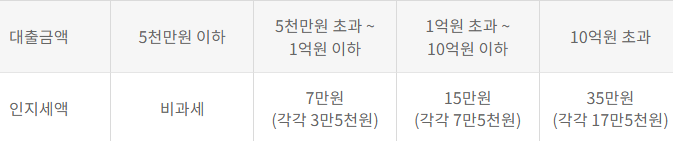 인지세란 대출 신규 약정 시 내는 세금으로 대출 금액에 따라 세액이 위 처럼 차등적용됩니다.