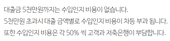 인지세란 대출을 새로 약정할 때 내는 세금으로 5천만원 이하까지는 비과세이며 대출금액이 5천만원 초과 시 7만원 , 1억원 초과 시 15만원이며 은행과 고객이 각각 50%씩 부담합니다.