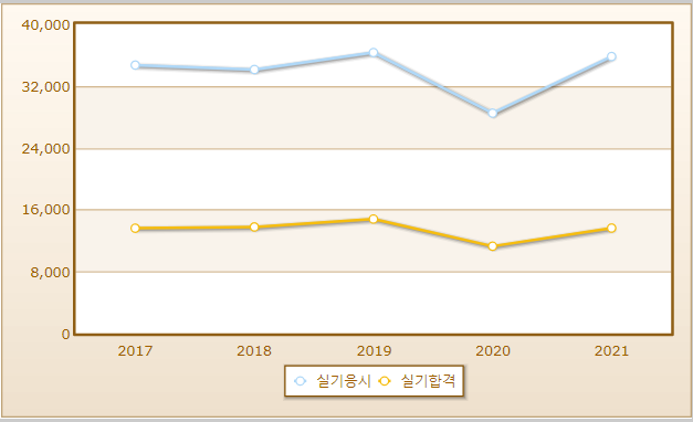 실기시험의 경우 2021년도를 기준으로 35,799명이 응시했으며 13,613명이 합격했습니다.