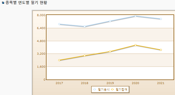 식품기사 필기 연도별 합격률 표입니다. 2021년 기준 응시자 수는 7,519명으로 그중 합격자는 3,673명입니다.