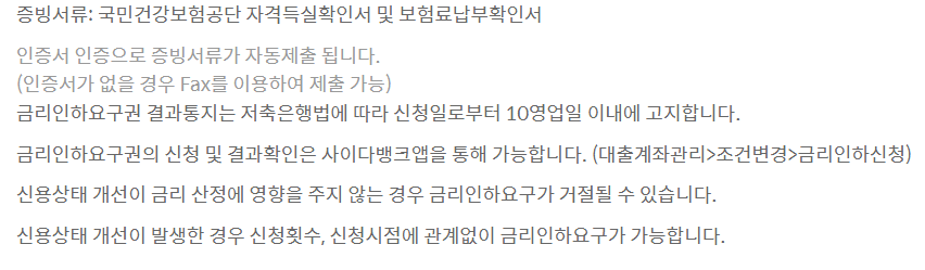 금리인하요구권은 본인의 신용상태에 현저한 변동이 있는 경우 (직장 변동,소득 증가, 부채감소, 신용등급 상승 등)증빙료를 제출해 금리인하요구권을 신청할 수 있습니다.