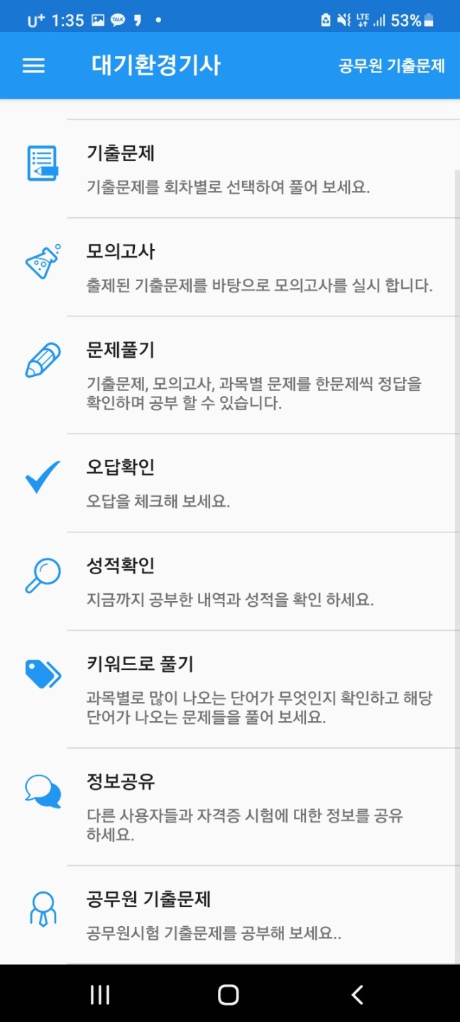 어플을 이용하여 연도별 기출문제와 모의고사 오답 확인이 가능하며, 다른 자격증 준비생들과 시험에 대한 정보공유도 가능합니다. 필기시험 합격률이 높지 않은 만큼 문제를 많이 풀어 꼭 시험에 합격하시길 바라겠습니다.