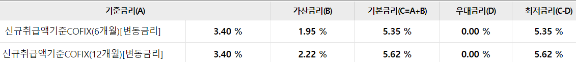 대출 금리는 변동금리 6개월 ,12개월 상품이 있으며 몇개월 짜리 변동금리 상품을 선택하는지에 따라 아래와 같이 금리의 차이가 있습니다.