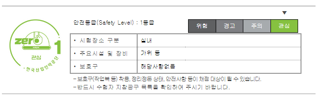 실기시험의 경우 다칠 우려가 있는 장비들을 사용하는 시험이다 보니 안전등급 1등급으로 지정되어있습니다.