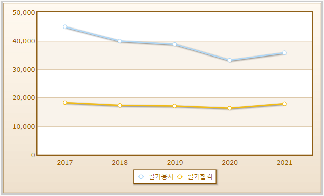 필기시험의 경우 2021년도를 기준으로 35,725명이 응시하였고 이중 17,793명이 합격했음을 알 수 있습니다.