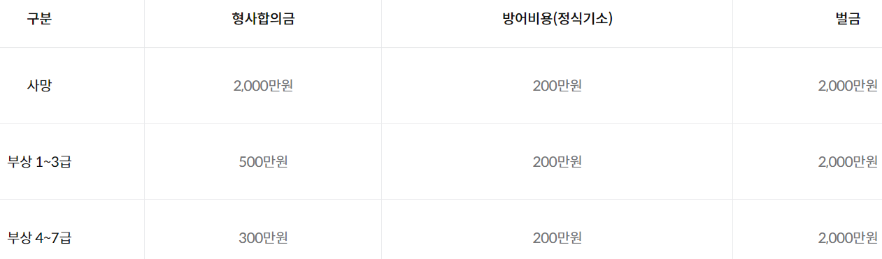 가입한 자동차의 사고로 다른 사람을 다치게 하거나 사망하게 하여 형사상 책임을 지거나 형법 제 258조 1항 또는 2항, 교통사고처리 특례법 제4조 1항의 2호에 중상해를 입힌 경우 법률 비용을 지급합니다.