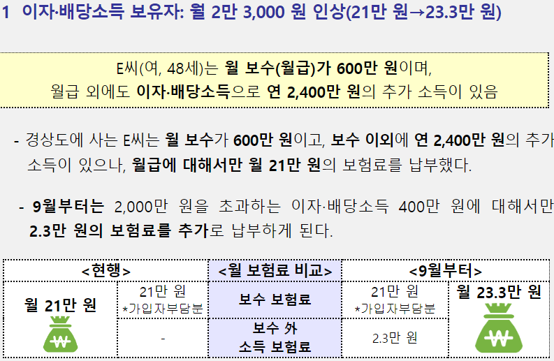이에 따라 보수(월급) 외 임대,이자,배당,사업소득 등 연간 2천만원을 넘는 2%의 직장가입자가 보험료를 내도록 기준을 강화합니다.