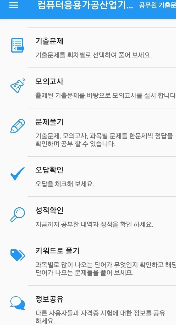 자격증 및 공무원 시험 공부를 할수 있는 기출문제앱 입니다!! 100종목 이상의 자격증 기출문제와 2007년부터 2018년 상반기까지의 공무원 시험 기출문제를 풀어 볼 수 있습니다. 1. 기출문제 기