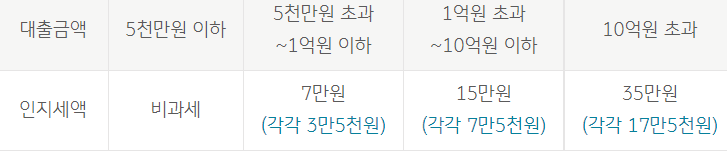 인지세란 대출 거래 신규 약정 시 내는 세금으로 세액은 아래 대출 금액에 따라 차등 적용되며 이 인지세는 은행과 고객이 각각 50%씩 부담합니다.
